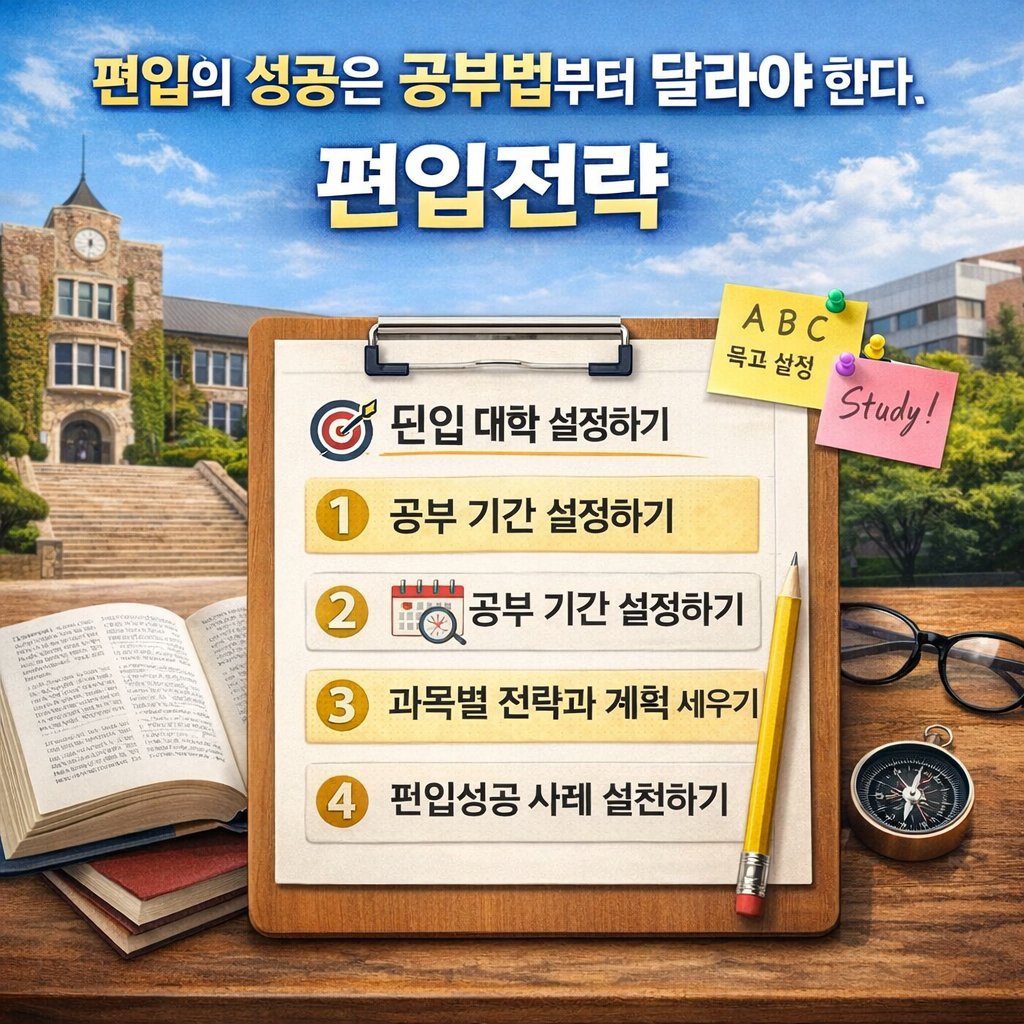이처럼 목표가 분명하면, 중도 포기 확률이 현저히 낮아집니다. 편입은 최소 6개월~1년 이상 장기 레이스이기 때문에 “왜 시작했는가”가 매우 중요합니다.