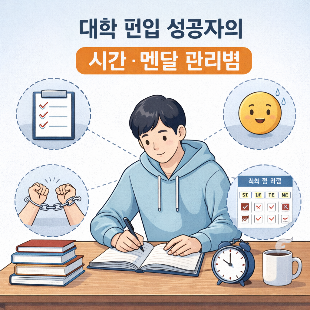 편입 실패의 가장 큰 원인은 실력이 아니라 지속하지 못함입니다. 성공자들은 특별한 멘탈을 가진 것이 아니라, 관리 방법을 알고 있었습니다.